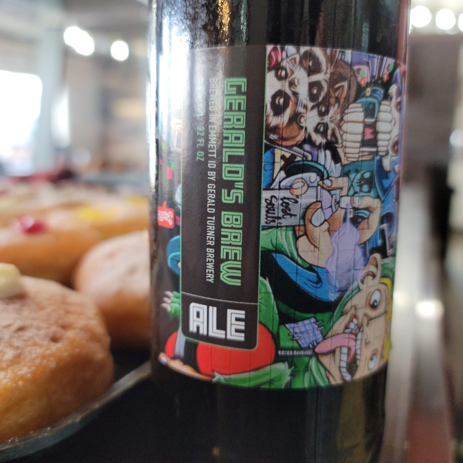 Gerald's Brew Beer on a counter with donuts in the background at Fourth Street Fusion